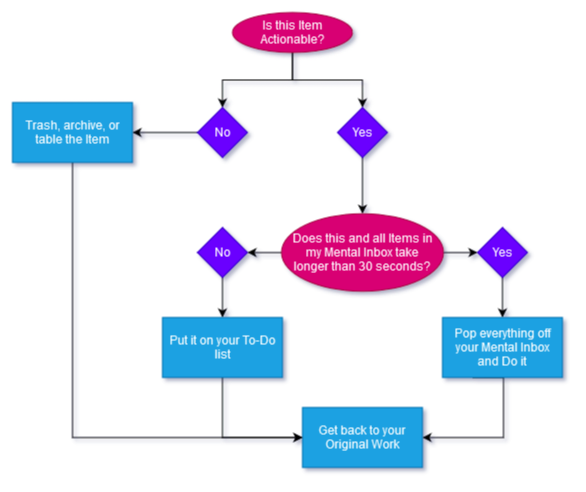 If it is Actionable and it can be dealt with right now and quickly (<5 minutes), do it and move on. If you cannot, it should to go onto some Action List, a backlog of To-Do’s for later.